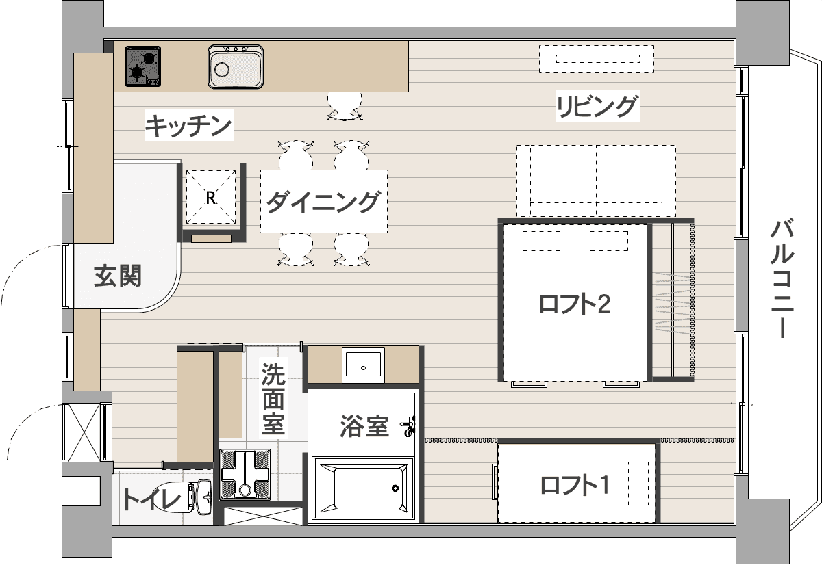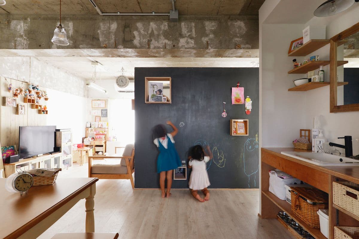 家族が寄り集まって暮らす団地のノスタルジーを求めた施主様に、家全体が回遊動線でどこにいても家族がつながる間取りで応答。家の中心に配置したダイニングと、下部がWICのロフトの寝室のまわりを自由に動き回れます。黒板の壁やロフトに散りばめた小窓など、楽しく遊べる住まい。