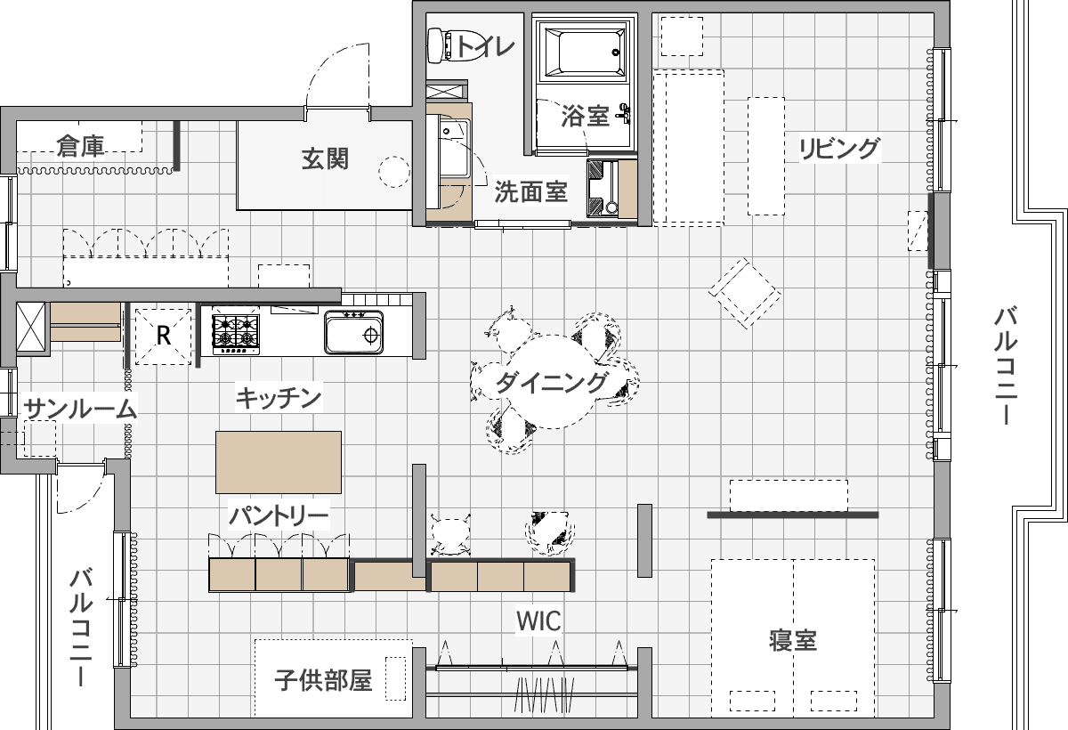 お施主さまが4年間住んでいたデンマークで集めた、お気に入りの家具をゆったりと置けるプランニング。